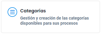 Permite administrar el maestro de Categorías. Esta información la utilizaremos para agrupar los procesos, de tal modo que el usuario, para crear una nueva solicitud, visualizará todos los procesos disponibles agrupados por la categoría.