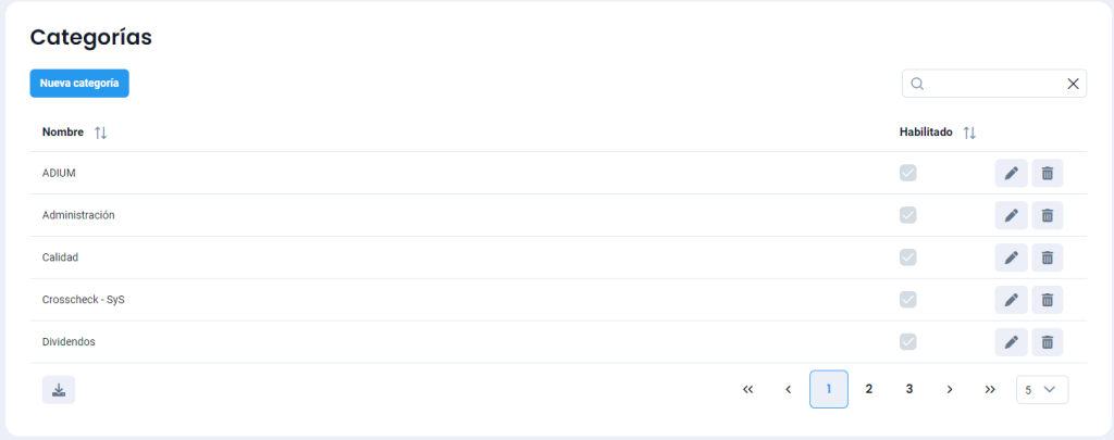 Al pulsar el botón de «Categorías» se nos abrirá un listado con todas las categorías configuradas, así como el indicador de si están habilitadas o no.