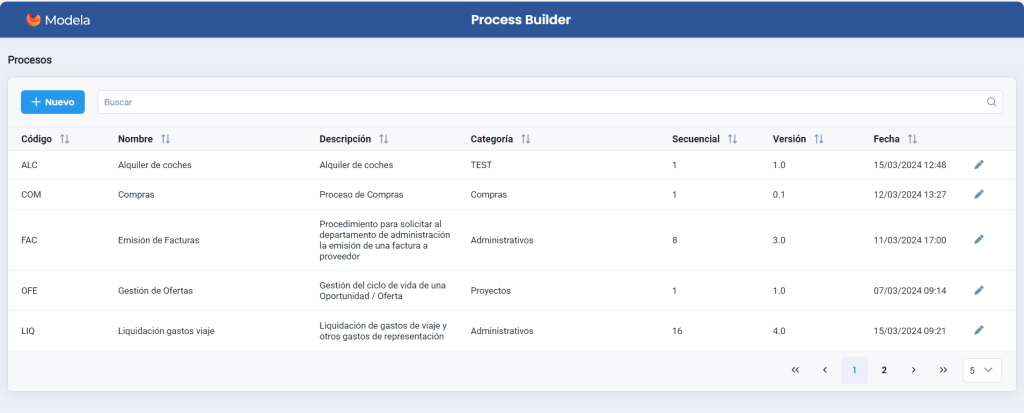 Puedes editar cualquiera de los procesos mostrados pulsando sobre el icono “Editar” a la derecha de cada fila. Para crear un nuevo Proceso, pulsa sobre el botón “Nuevo” situado arriba a la izquierda; a continuación se te abrirá una nueva pantalla dónde podrás incluir toda la información referente al mismo.