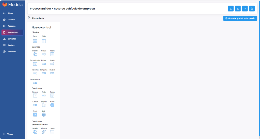 En esta pestaña encontrarás el diseñador de formularios, que te permitirá diseñar la información que contendrá tu proceso, como se organizará visualmente, y toda la lógica asociada al mismo.