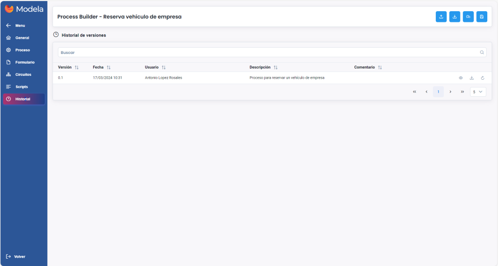 Cualquier cambio que realices en tu proceso, quedará registrado como una versión del mismo. Esas versiones podrás visualizarlas desde esta pestaña, de tal manera que puedas llevar un control sobre todas las modificaciones realizadas, e incluso volver a una versión anterior del proceso si lo necesitas.